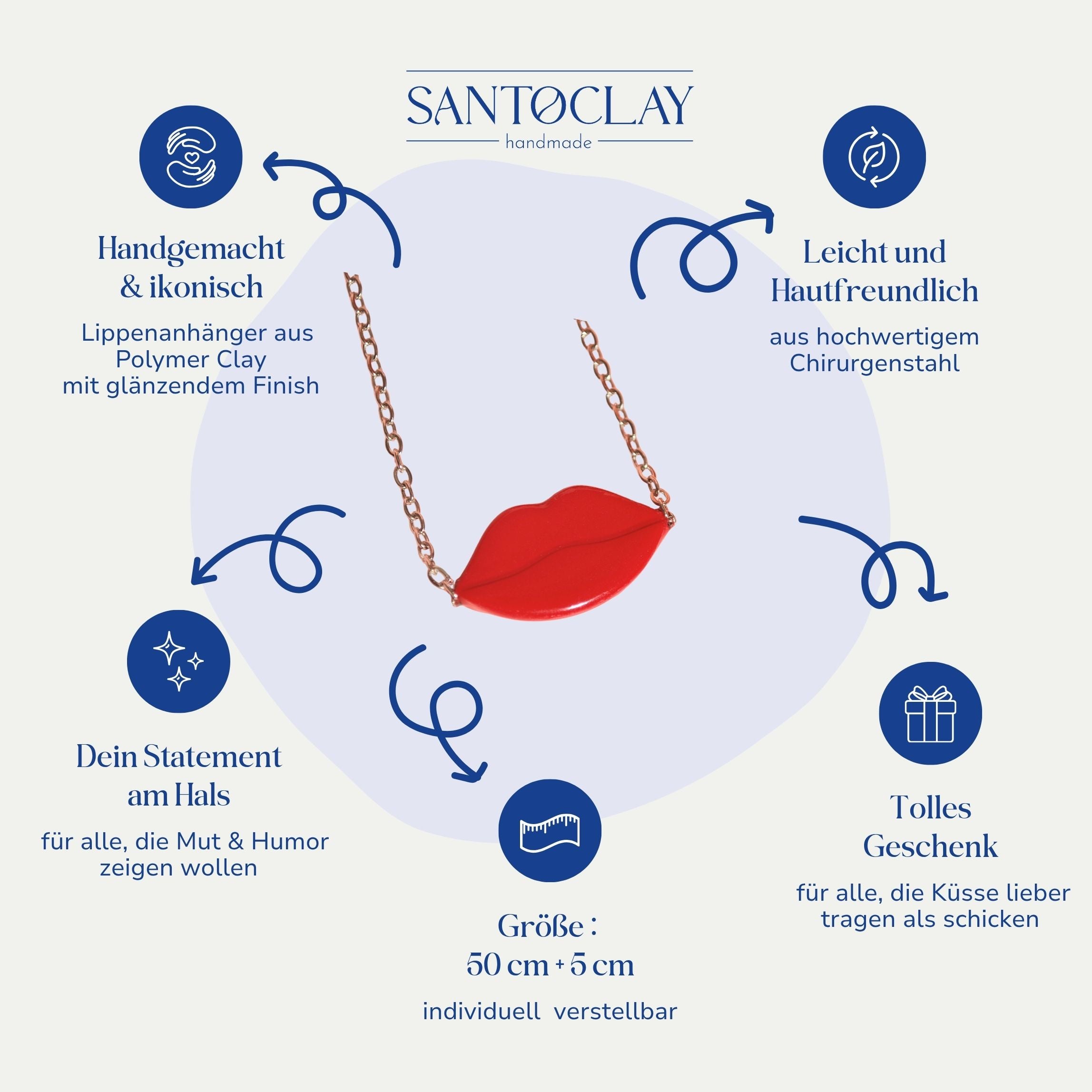 Die handgeformten roten Lippen aus Polymer Clay setzen ein modernes Highlight und stehen für Selbstbewusstsein und Individualität.