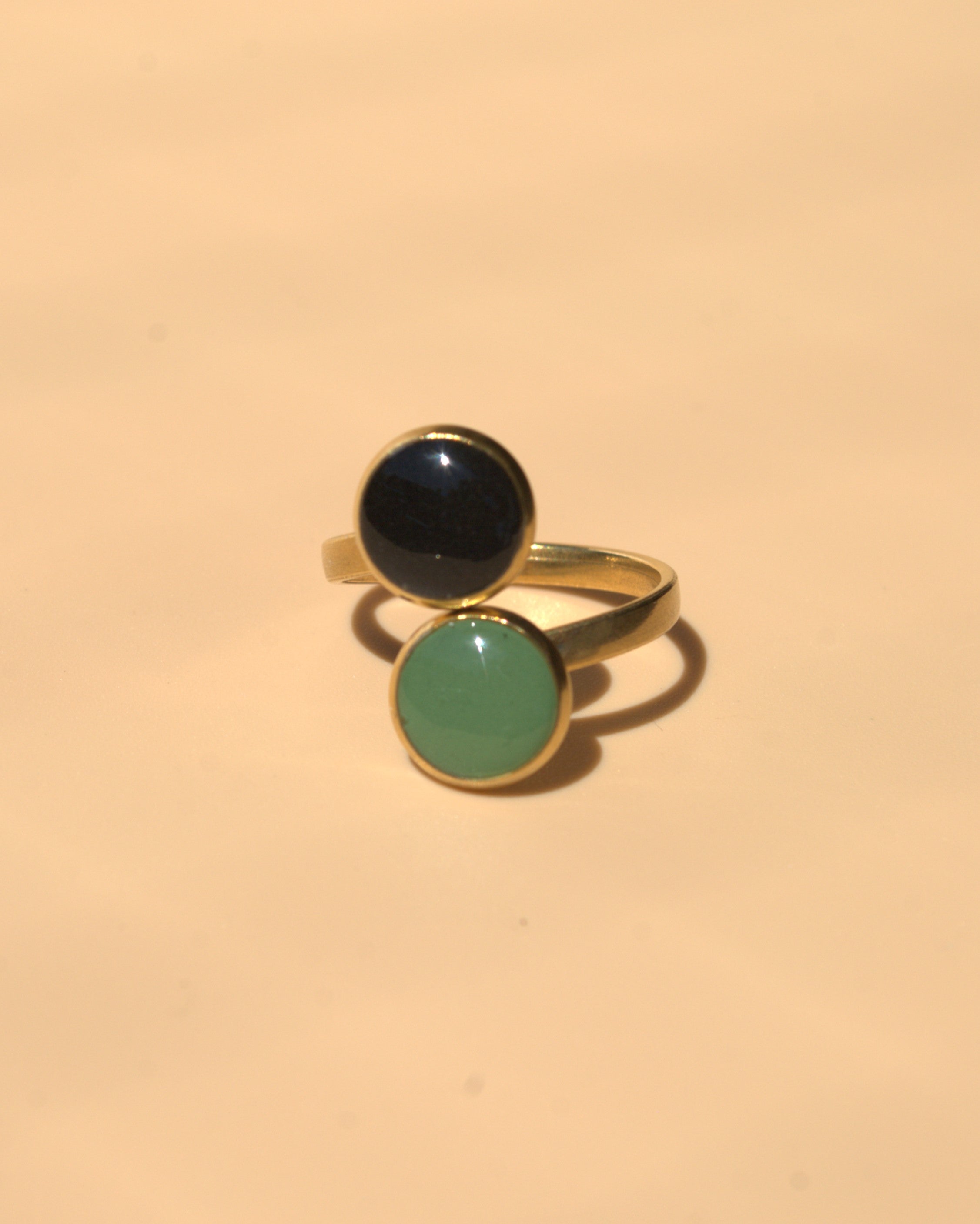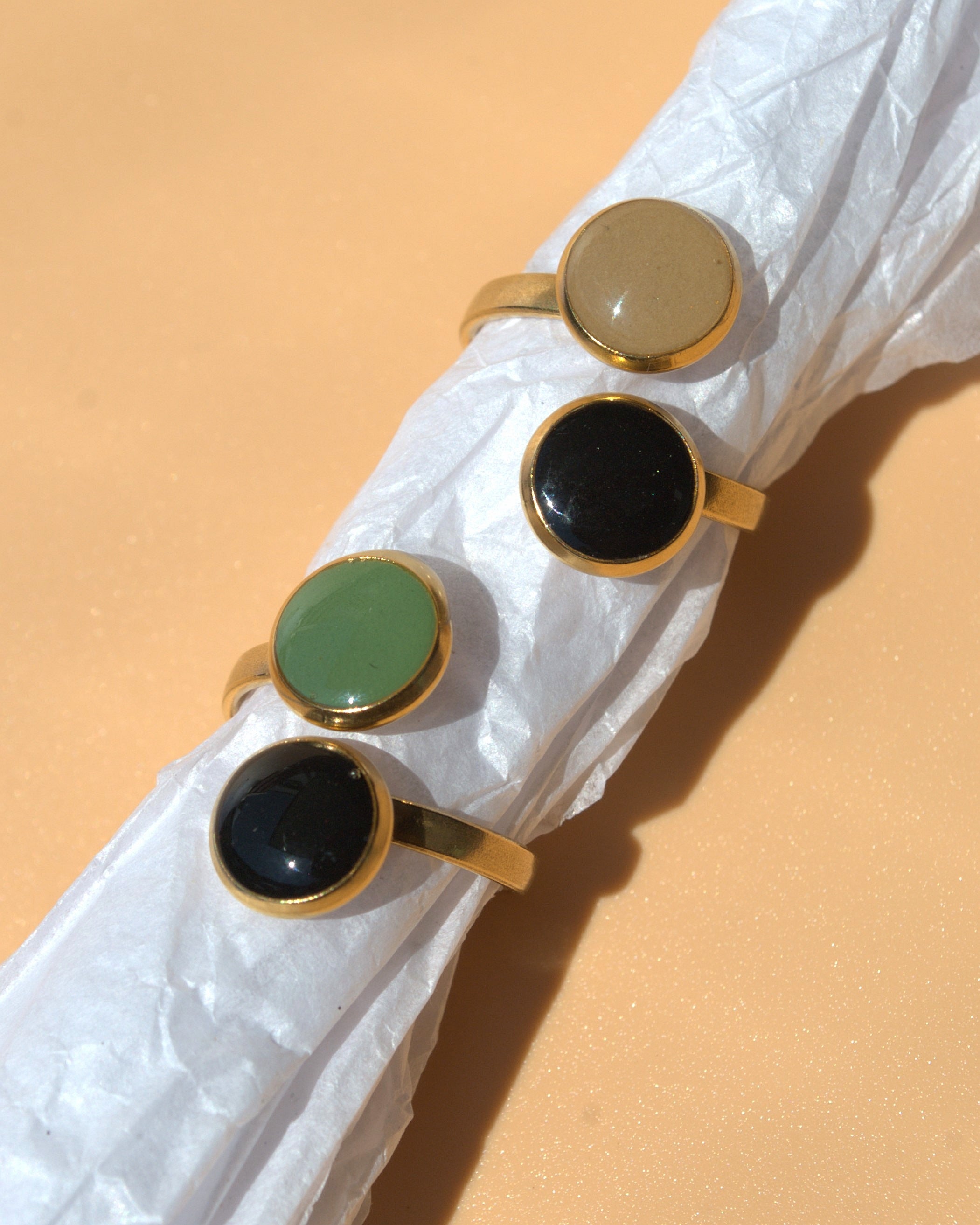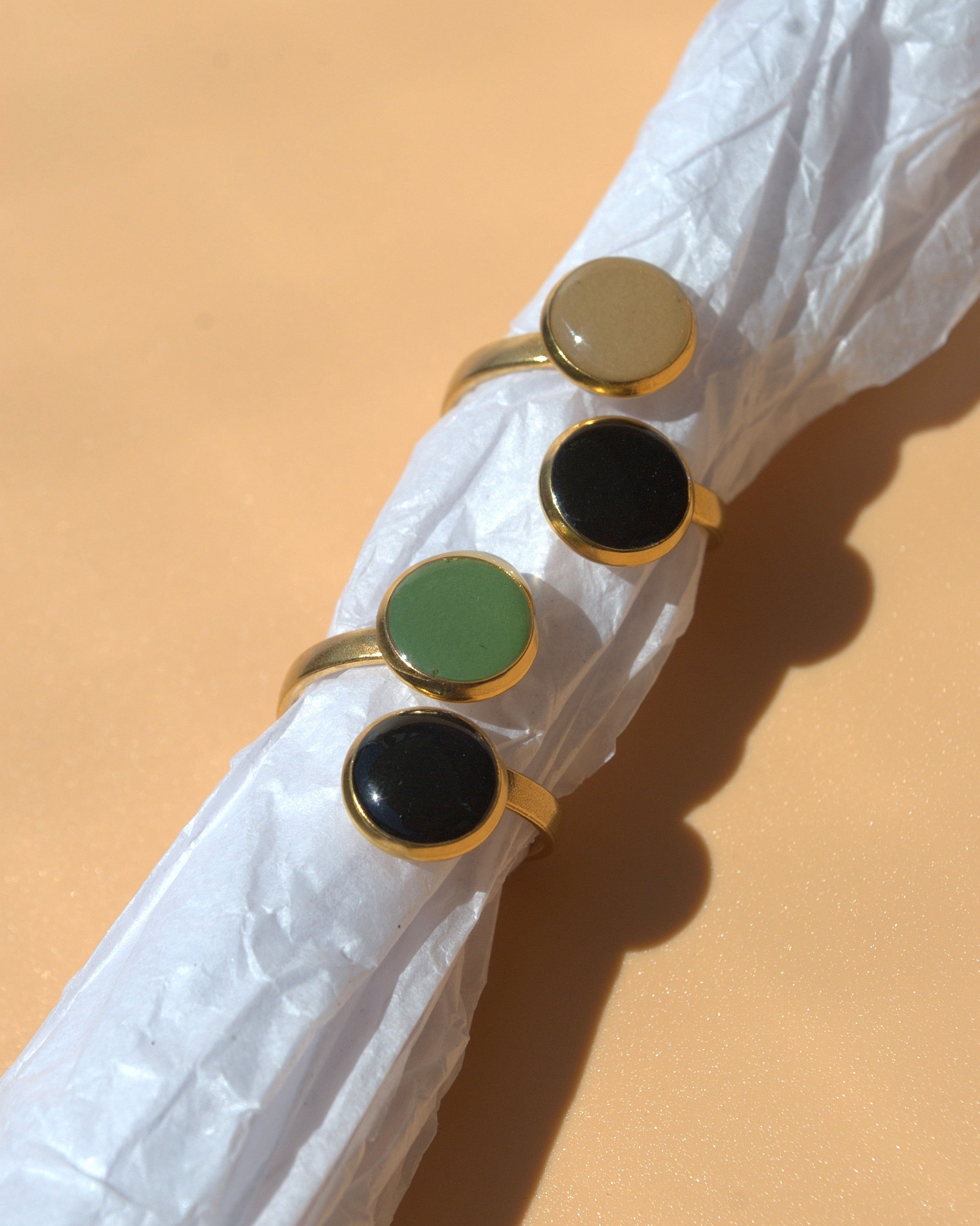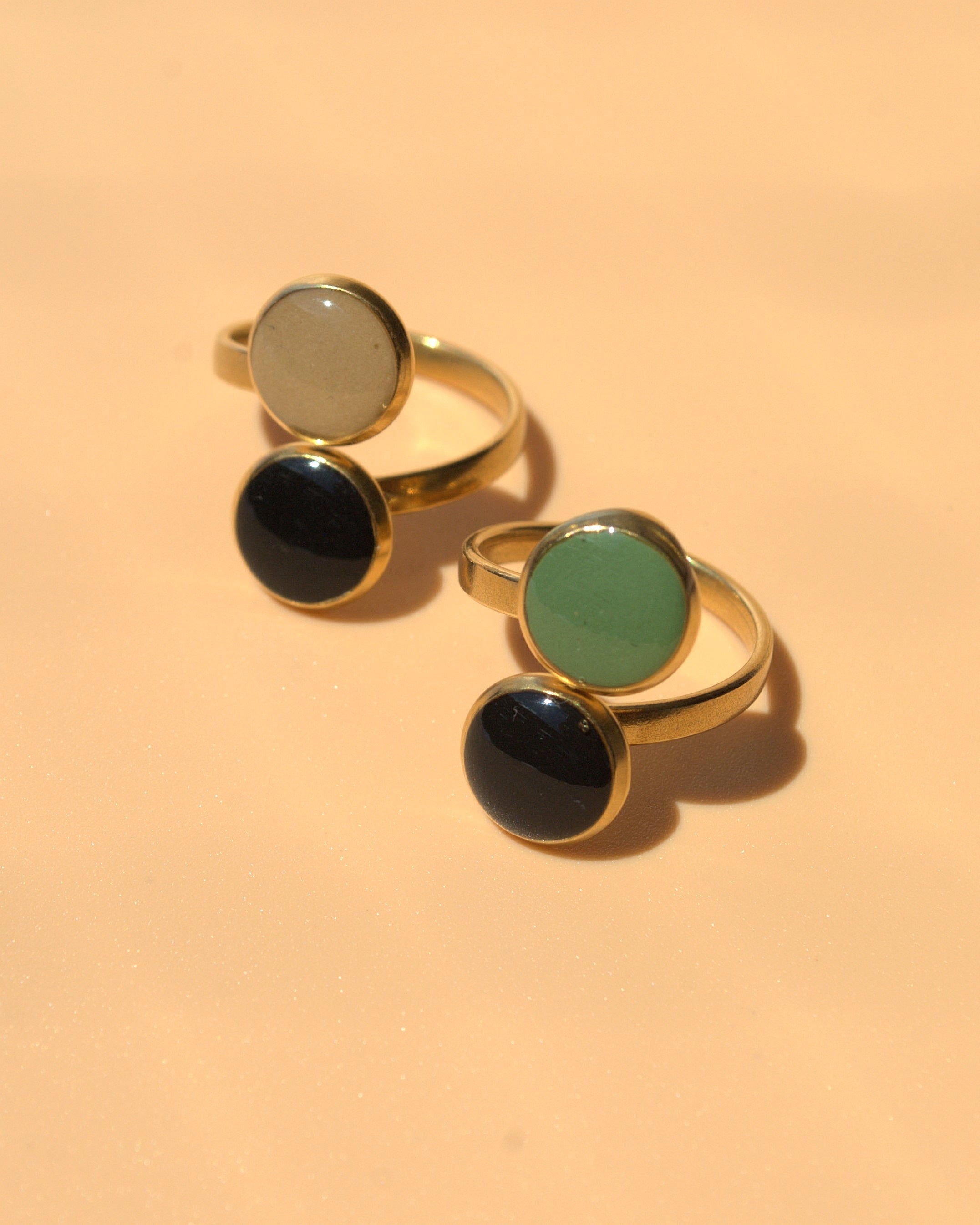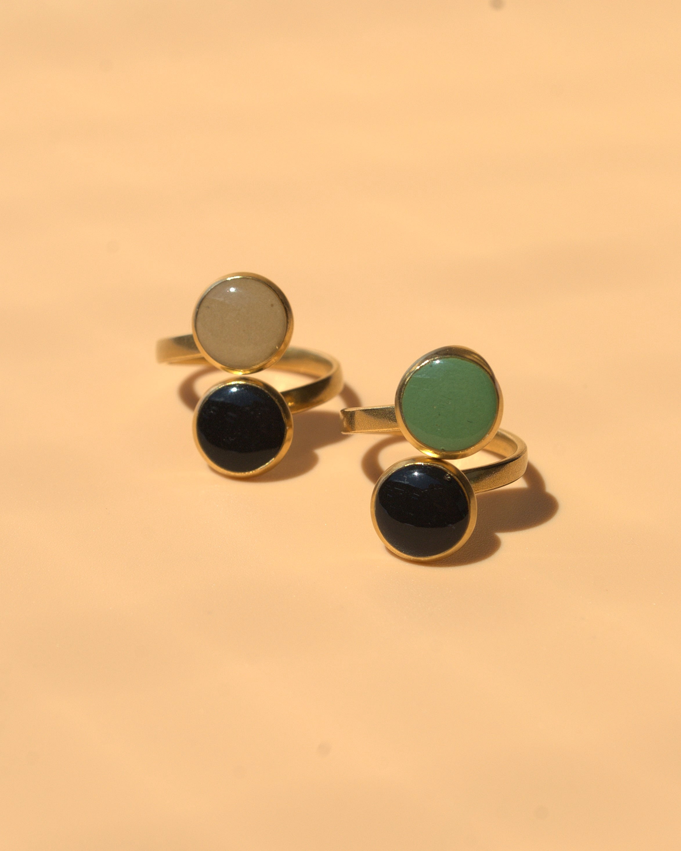 Vergleich zwischen dem handgemachten Statement Ring Kreis Karamell & Mint von Santoclay und herkömmlichem Modeschmuck
