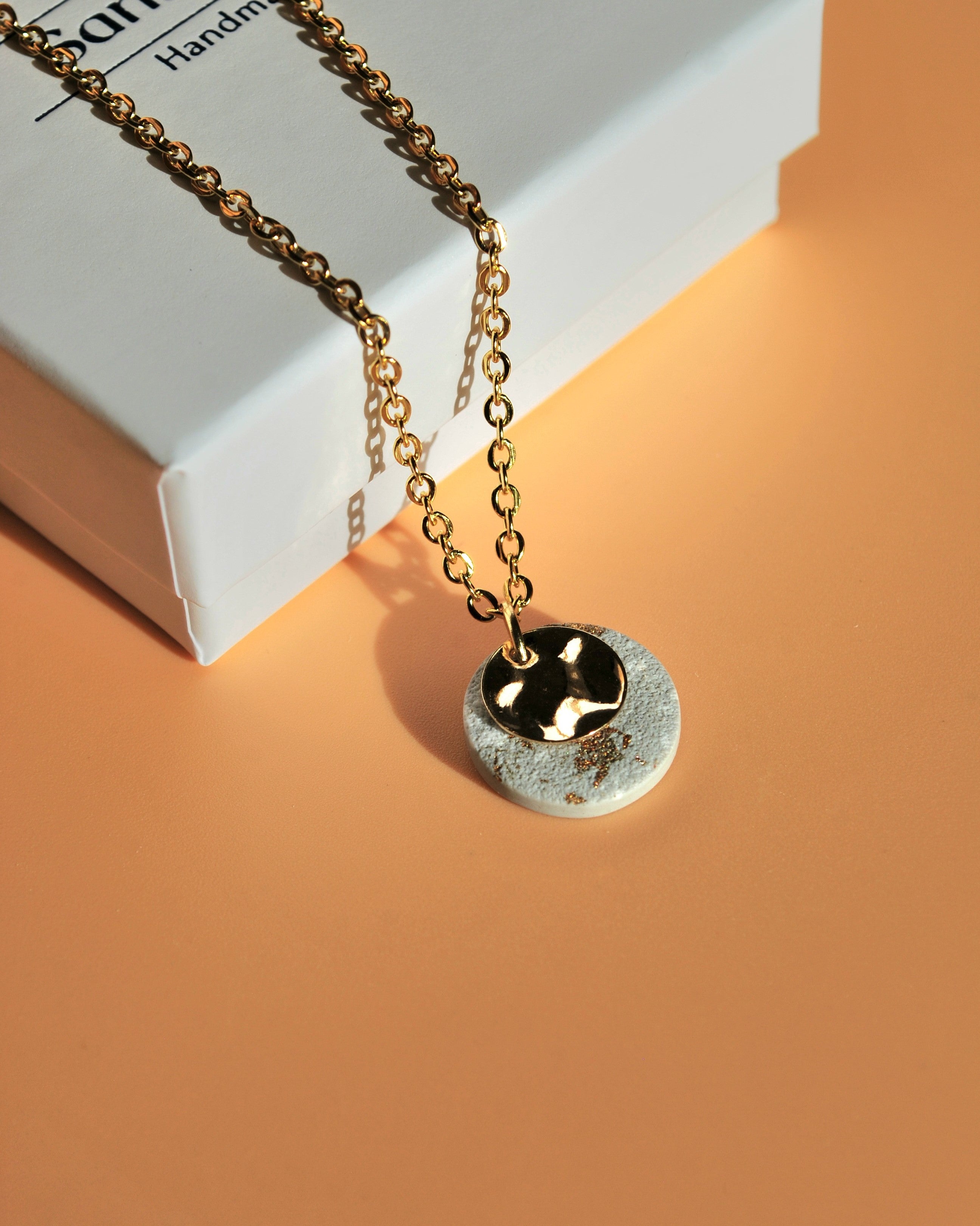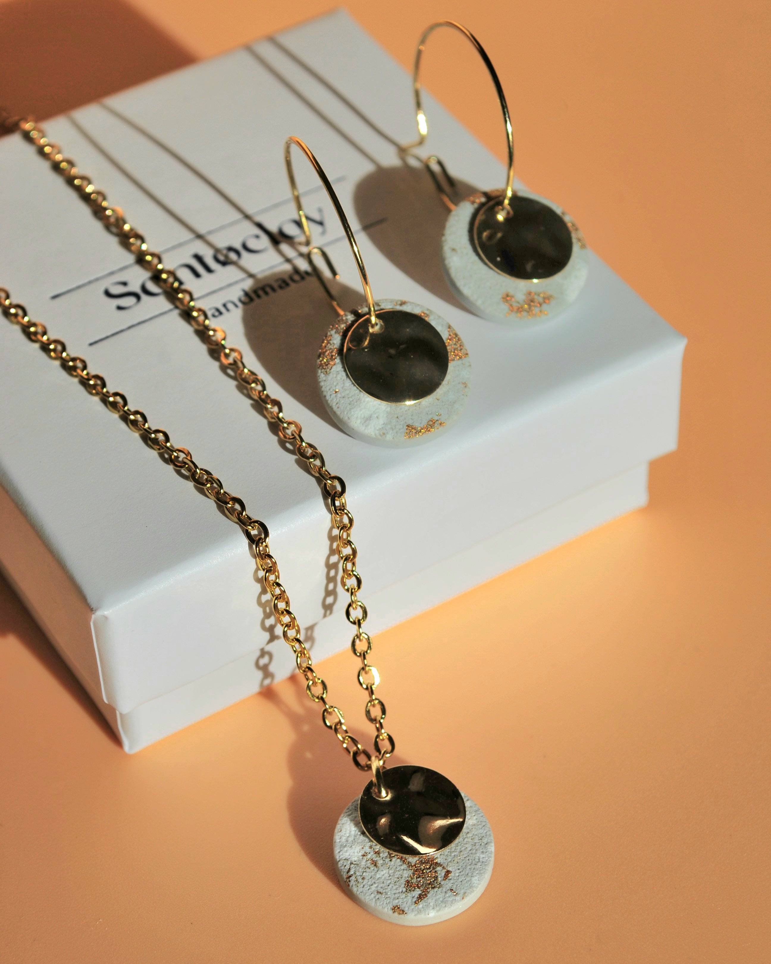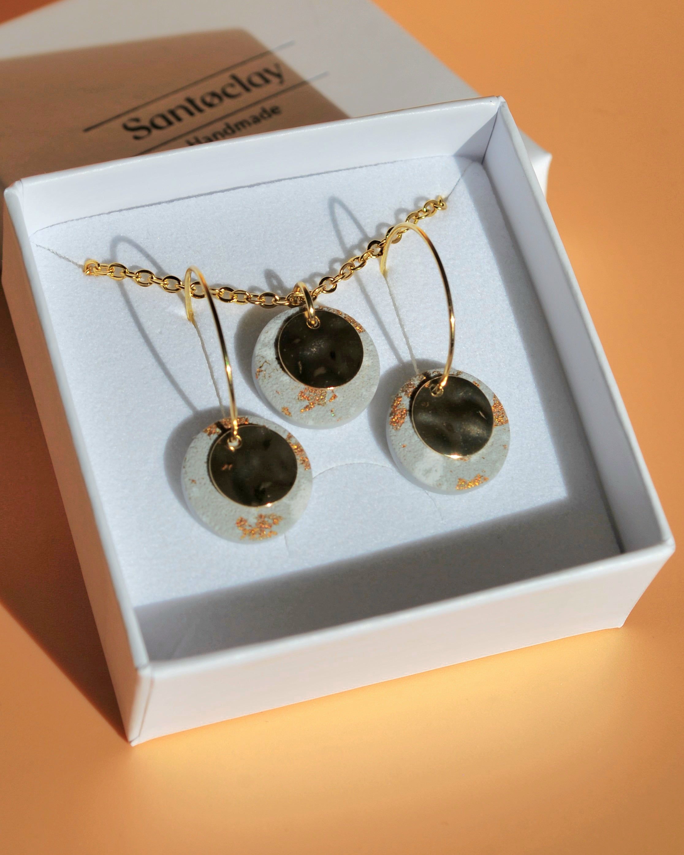 Das „Maria“-Schmuckset vereint feine Creolen und eine filigrane Halskette – beide gefertigt aus hochwertigem, 18K vergoldetem Chirurgenstahl und veredelt mit grauem Polymer Clay im seidigen Keramik-Look. Ideal für alle, die ein dezentes Statement setzen möchten – minimalistisch, aber mit Charakter.